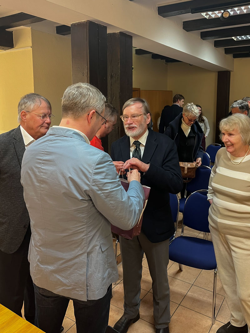 Mit langanhaltendem Applaus würdigten die Mitglieder die jahrelange und intensive Ortsvereinsarbeit des scheidenden Vorsitzenden. Steguweit und Mittelbach überreichten dem frankophilen Strempel zu dessen großer Freude als Dank Gaumenfreuden aus unserem Nachbarland westlich des Rheins.